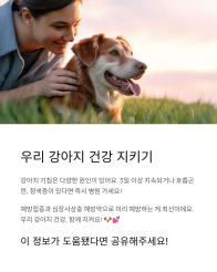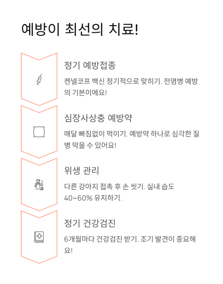 예방이 최선의 치료예요! 켄넬코프 백신을 정기적으로 맞히고, 심장사상충 예방약을 매달 빠짐없이 먹이는 게 정말 중요해요. 예방약 하나로 우리 강아지를 심각한 질병으로부터 지킬 수 있답니다!
