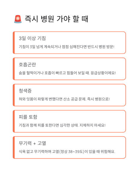특히 주의해야 할 건 호흡곤란 증상이에요. 기침하면서 숨을 헐떡이거나, 혀와 잇몸이 파랗게 변한다면 산소 공급이 제대로 안 되는 거예요. 이건 정말 응급상황이니까 즉시 병원에 가야 해요! 밤이라면 야간 응급동물병원을 찾아가세요.