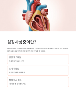 강아지 심장사상충은 모기를 통해 전염되는 기생충 질병이에요. 심장과 폐동맥에 20~30cm의 기생충이 자라면서 심부전을 일으키는 무서운 질병이죠. 초기에는 증상이 없지만, 진행되면 기침, 호흡곤란, 복수 등이 나타나고 결국 사망에 이를 수 있어요.