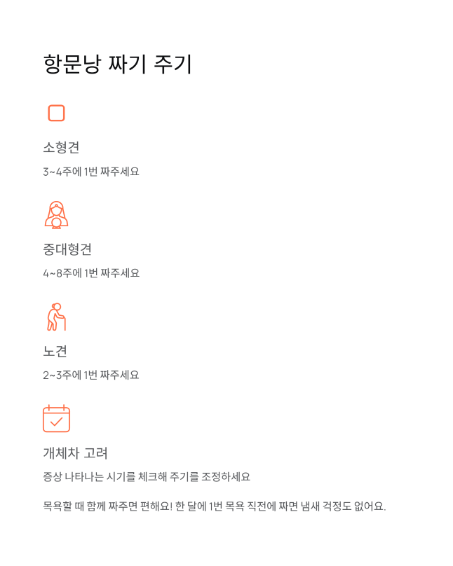 저는 한 달에 한 번 목욕할 때 같이 짜줘요. 목욕 직전에 짜면 냄새 걱정도 없고 딱 좋더라고요!