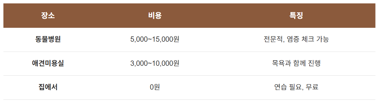 대부분 미용실에서 목욕할 때 무료나 저렴하게 해줘요. 저는 한 달에 한 번 목욕 시킬 때 같이 부탁해요. 추가 비용 없이 해주더라고요!