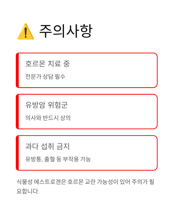 식물성 에스트로겐은 호르몬 교란 가능성이 있어, 특히 호르몬 치료 중이거나 유방암 위험이 있는 분은 전문가 상담이 필수입니다. 과다 섭취 시 유방통, 출혈 같은 부작용이 나타날 수 있으니 주의해야 합니다.