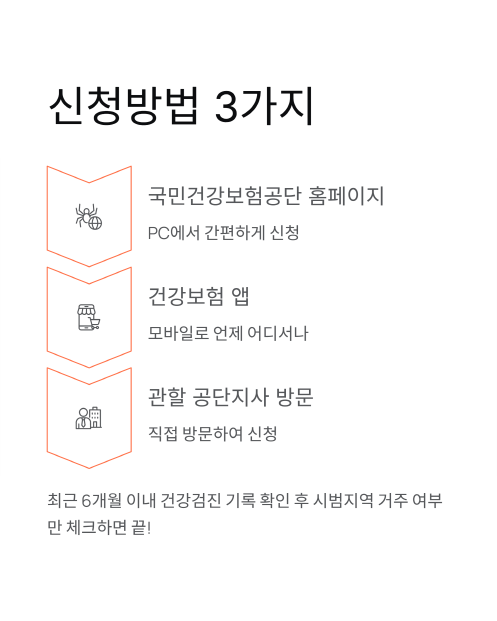 저는 앱으로 신청했는데 정말 편하더라고요. 최근 6개월 이내 건강검진 기록이 있는지만 확인하고, 시범지역에 거주하는지 체크하면 끝이에요!
