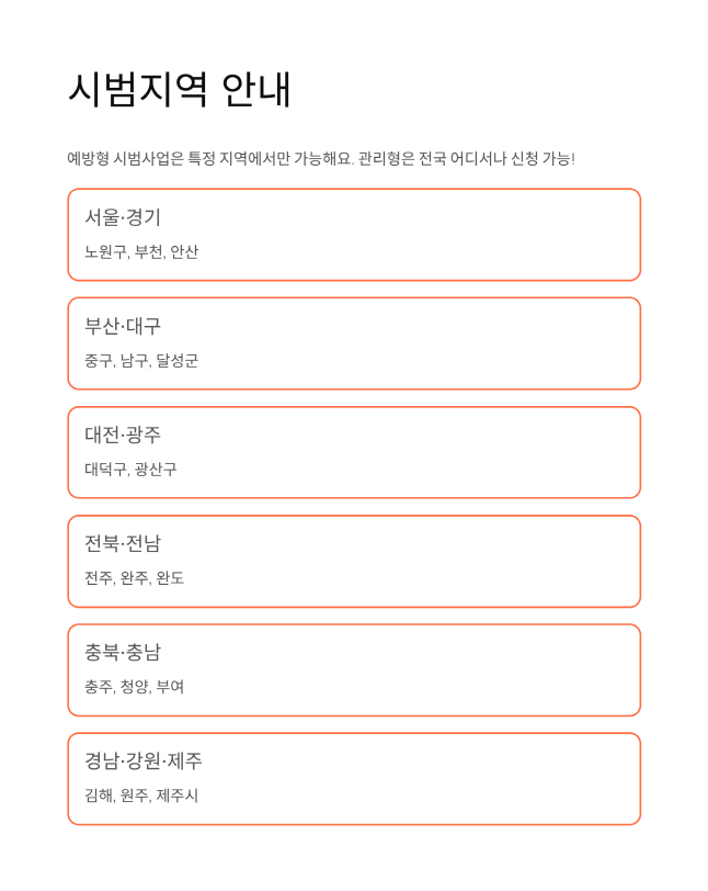 예방형 시범사업은 이 지역들에서만 가능해요. 하지만 관리형은 전국 어디서나 신청할 수 있으니 참고하세요!