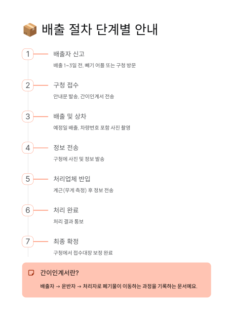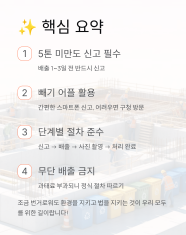 신고 후 배출, 상차 사진 촬영, 처리 완료까지 각 단계별로 정보를 공유해야 하니 절차를 잘 기억해두세요. 무단 배출은 과태료가 부과되니 꼭 정식 절차를 따라주세요. 조금 번거로워도 환경을 지키고 법을 지키는 것이 우리 모두를 위한 길이랍니다!