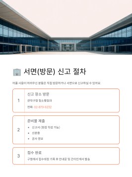 어플 사용이 어려우신 분들은 직접 방문하거나 서면으로 신고하실 수 있어요.