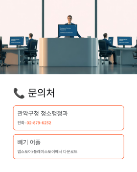 공사장 생활폐기물은 5톤 미만이라도 반드시 배출 1~3일 전에 신고해야 해요. '빼기' 어플을 이용하면 간편하게 신고할 수 있고, 어플 사용이 어려우면 관악구청 청소행정과에 방문하거나 전화로 신고하면 됩니다.