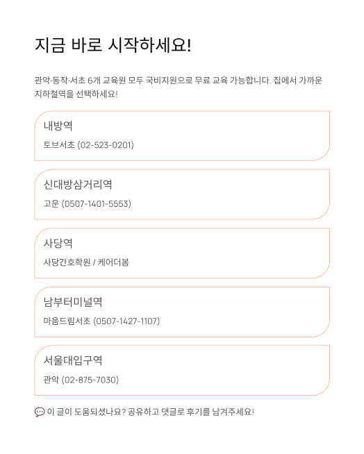 관악 동작 서초 국비지원 요양보호사교육원 6곳을 살펴봤어요. 내방역의 토브서초, 신대방삼거리역의 고운, 사당역의 사당간호학원과 케어더봄, 남부터미널역의 마음드림서초, 서울대입구역의 관악요양보호사교육원 모두 국비지원으로 무료 교육 가능해요. 집에서 가까운 곳, 지하철 노선이 편한 곳을 선택하세요!