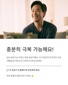 남성 갱년기는 40대 후반~50대에 테스토스테론이 감소하면서 나타나는 자연스러운 현상이에요. 만성 피로, 성욕 감소, 우울감, 복부비만, 근육량 감소 같은 증상이 있다면 자가진단을 해보고, 3개 이상 해당되면 병원 검진을 받아야 해요! 치료는 테스토스테론 보충요법(주사, 패치, 젤)이 주로 사용되며, 영양제와 생활습관 개선도 중요해요. 규칙적인 근력운동과 유산소 운동, 단백질과 아연 섭취, 충분한 수면과 스트레스 관리로 충분히 극복할 수 있답니다!