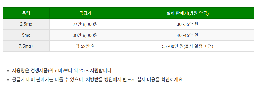 | 가격 | 위고비보다 다소 합리적이나 복용량 따라 차이 |