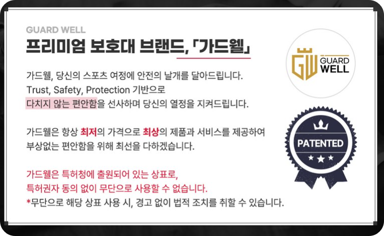 특허 기술: 가드웰은 한국 최초로 가벼운 소재와 통기성을 갖춘 제품을 제공하며, 부상 예방과 편안함을 위해 설계되었습니다.