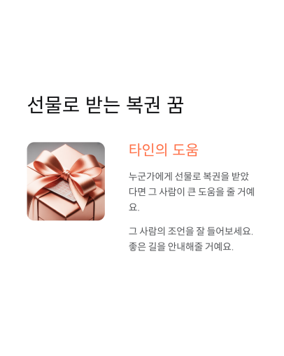 누군가에게 선물로 복권을 받았다면 그 사람이 큰 도움을 줄 거예요. 그 사람의 조언을 잘 들어보세요. 좋은 길을 안내해줄 거예요.