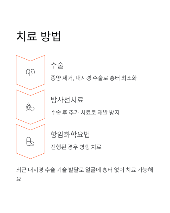 치료는 수술, 방사선치료, 항암화학요법을 병행하는데, 초기라면 수술로 종양을 제거하고 방사선치료를 추가해요. 진행된 경우엔 항암치료도 함께하죠. 최근엔 내시경 수술 기술이 발달해서 얼굴에 흉터를 남기지 않고도 치료할 수 있게 됐어요.