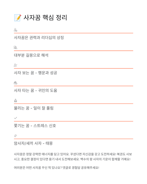 여러분은 어떤 사자꿈 꾸신 적 있나요? 그 후에 좋은 일 있었나요? 댓글로 경험담 공유해주세요! 다음 시간에는 '코끼리꿈 해몽 완벽 가이드'로 찾아올게요. 기대해주세요! 🐘