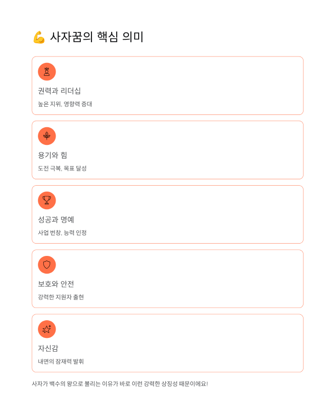 ✅ 사자꿈은 권력과 리더십의 상징 ✅ 대부분 길몽으로 해석 ✅ 사자 보는 꿈 - 행운과 성공 ✅ 사자 타는 꿈 - 귀인의 도움 ✅ 물리는 꿈 - 일이 잘 풀림 ✅ 쫓기는 꿈 - 스트레스 신호 ✅ 암사자/새끼 사자 - 태몽