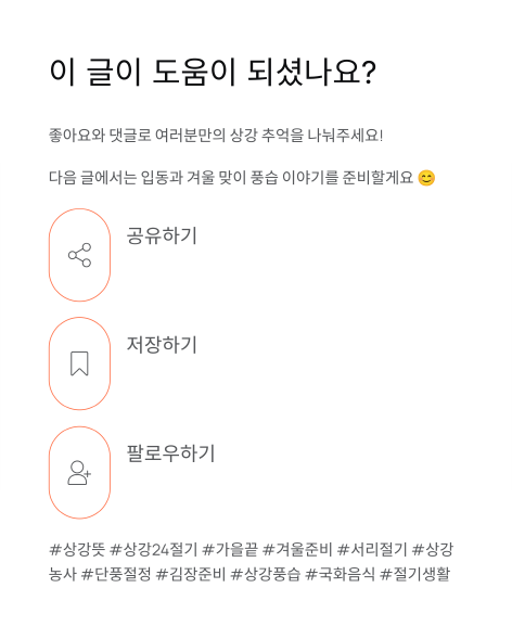 여러분은 상강 무렵에 특별히 챙기는 음식이나 건강법이 있나요? 댓글로 공유해주세요! 🍁