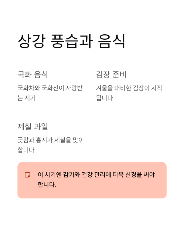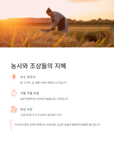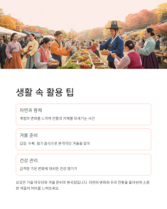 - 겨울 준비: 김장 준비를 시작하는 시기예요