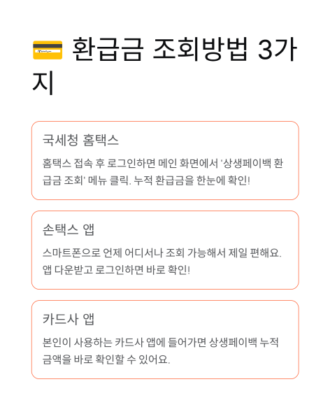 여러분은 이번달 환급금 얼마나 쌓이셨나요? 혹시 아직 조회 안 하셨다면 지금 바로 확인해보세요! 다음 글에서는 상생페이백 환급금을 더 많이 받는 꿀팁과 카드사별 추가 혜택을 알려드릴게요.