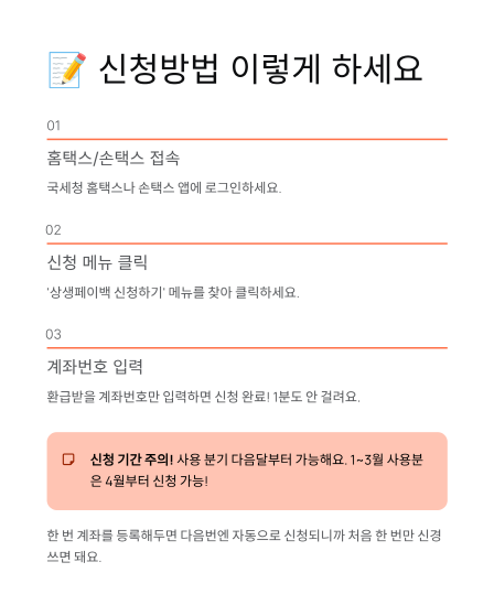 신청은 국세청 홈택스나 손택스 앱에서 할 수 있어요. 로그인 후 '상생페이백 신청하기' 메뉴를 클릭하면 돼요. 환급받을 계좌번호만 입력하면 신청 완료! 정말 1분도 안 걸려요.