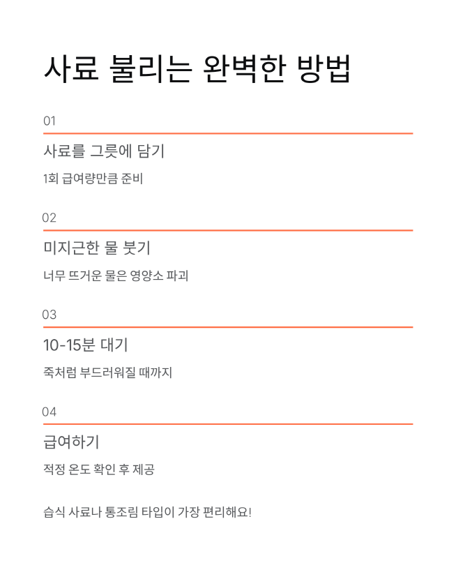 일반 사료도 물이나 미지근한 물에 충분히 불려주면 이빨 없는 강아지도 먹을 수 있어요. 사료를 그릇에 담고 물을 부어 10-15분 정도 불려주세요. 죽처럼 부드러워질 때까지 기다렸다가 주면 됩니다. 너무 뜨거운 물은 영양소를 파괴할 수 있으니 미지근하게!