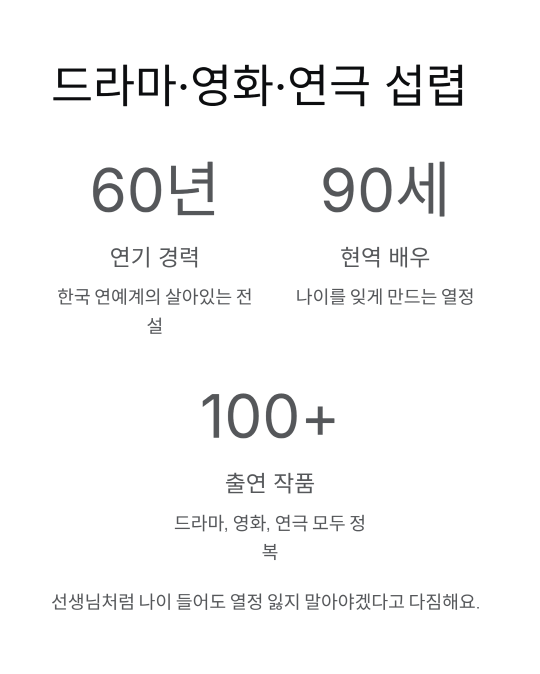 90세 나이에도 연기에 대한 열정을 잃지 않으시고, 후배들에게 본보기가 되어주시는 모습이 정말 감동적이에요.