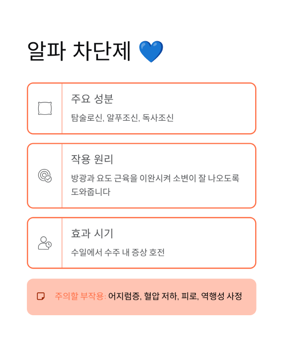 어지럼증이나 성기능 저하 등이 생기면 즉시 의료진과 상담하세요. 특히 알파 차단제 첫 복용 시 저혈압이 올 수 있으니 앉거나 누운 상태에서 복용하는 게 안전합니다.