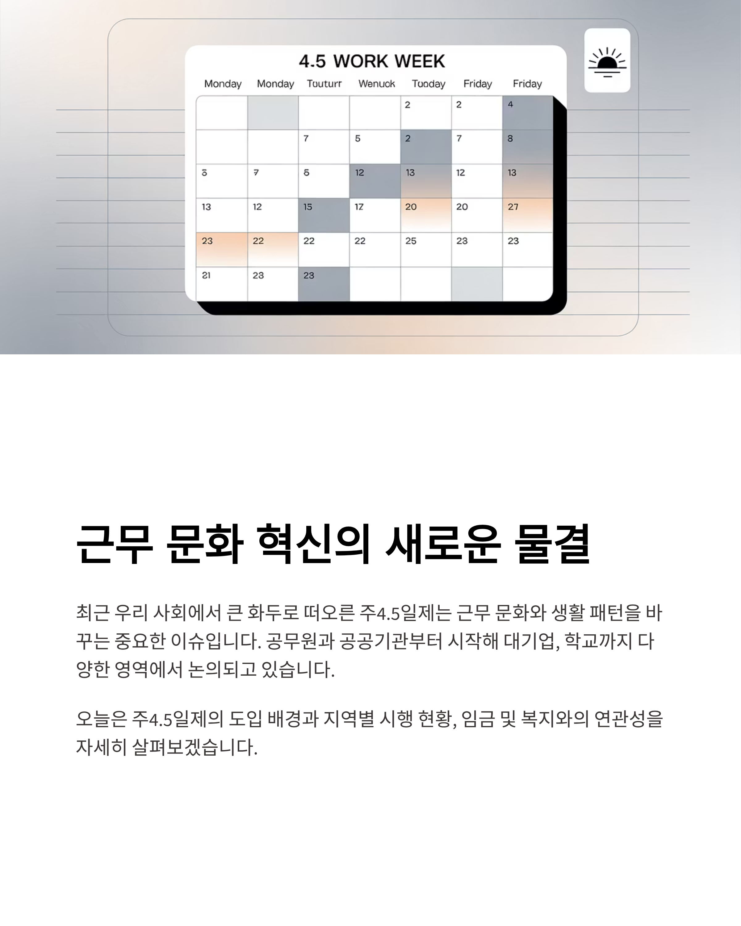 최근 우리 사회에서 큰 화두로 떠오른 주4.5일제는 근무 문화와 생활 패턴을 바꾸는 중요한 이슈입니다. 공무원과 공공기관부터 시작해 대기업, 학교까지 다양한 영역에서 논의되고 있는데요. 오늘은 주4.5일제의 도입 배경과 지역별 시행 현황, 임금 및 복지와의 연관성을 살펴보겠습니다.