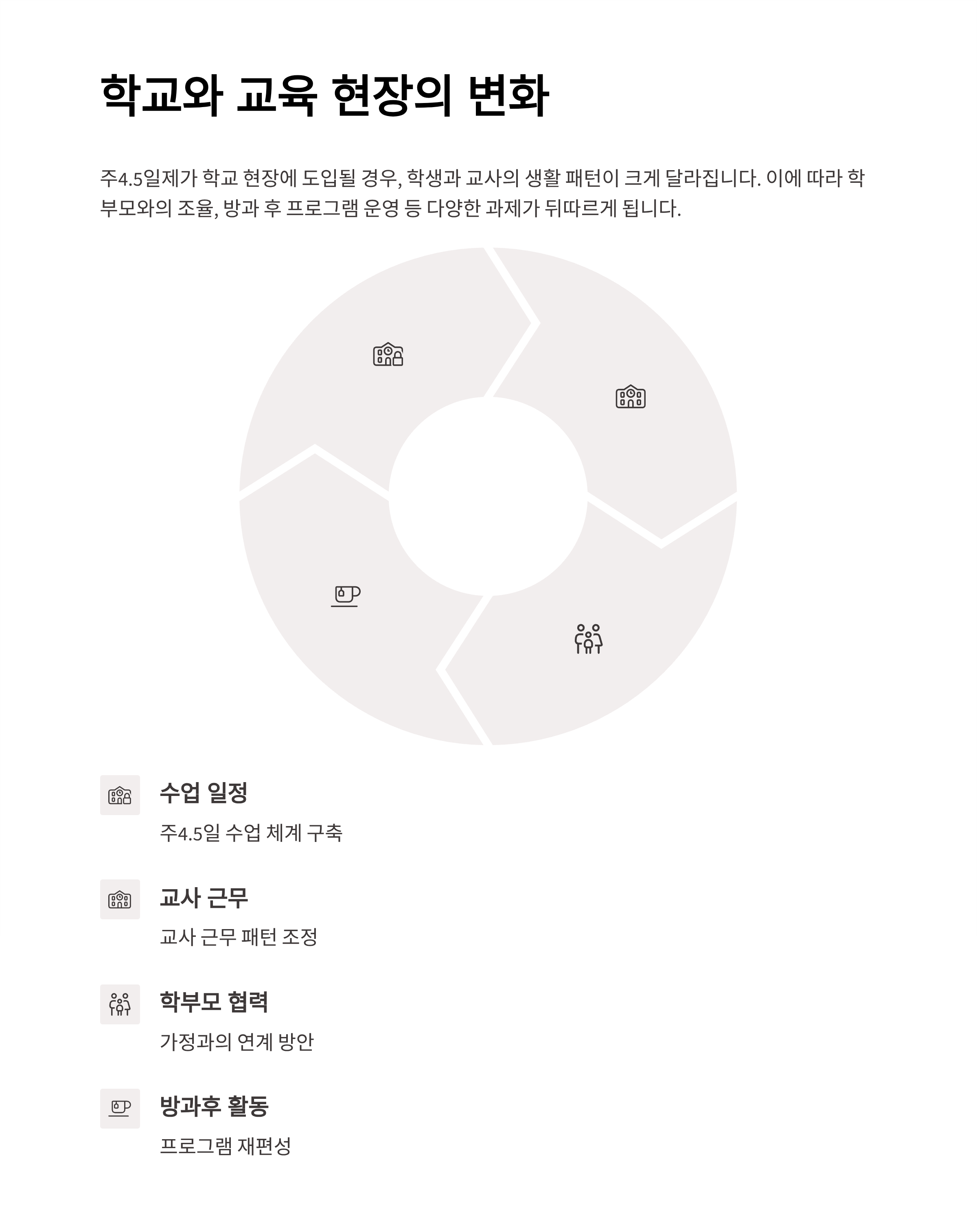 주4.5일제가 학교 현장에 도입될 경우, 학생과 교사의 생활 패턴이 달라집니다. 학부모와의 조율, 방과 후 프로그램 운영 등 다양한 과제가 뒤따릅니다.