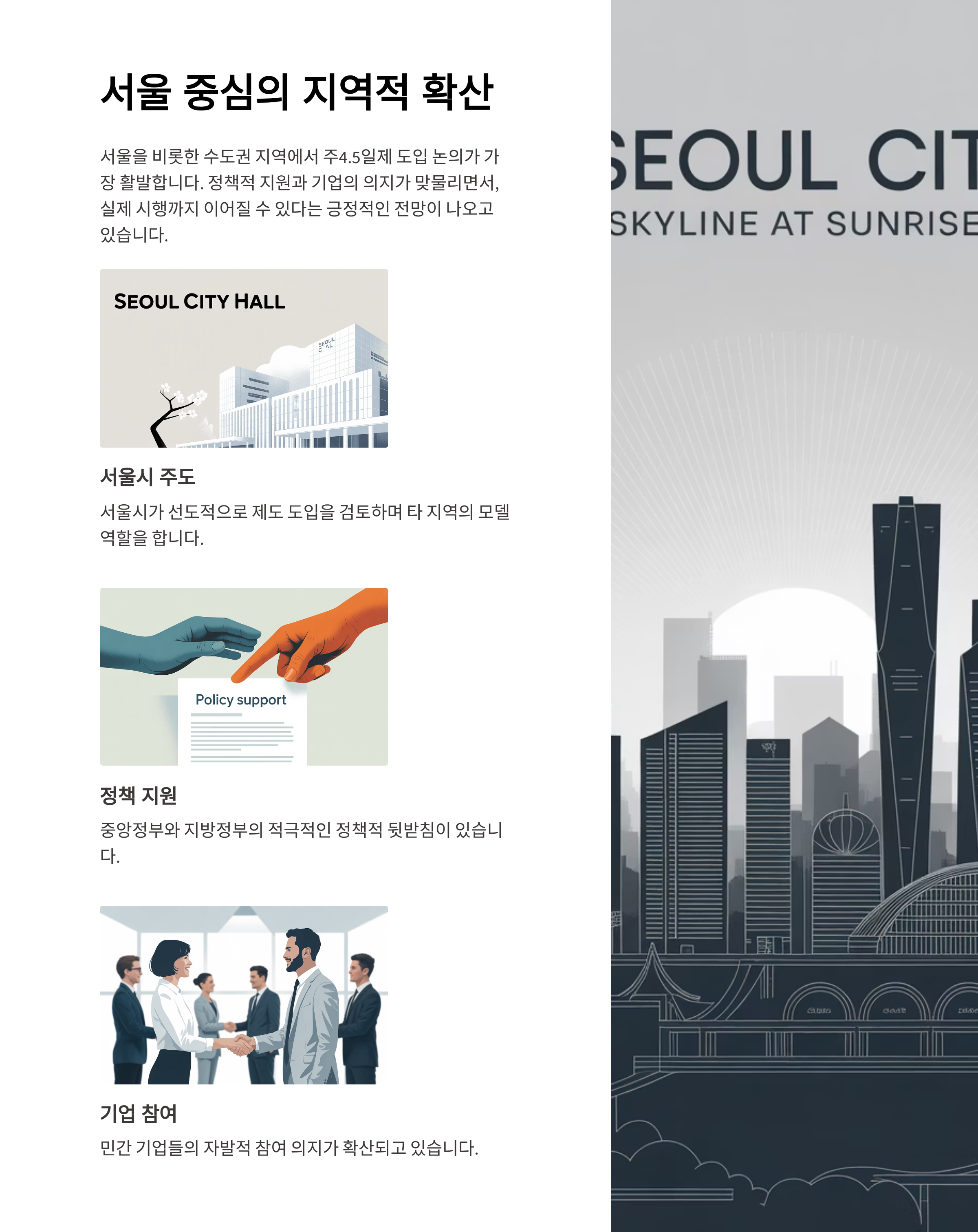 서울을 비롯한 수도권 지역에서 도입 논의가 활발합니다. 정책적 지원과 기업의 의지가 맞물리면서, 실제 시행까지 이어질 수 있다는 전망이 나옵니다.
