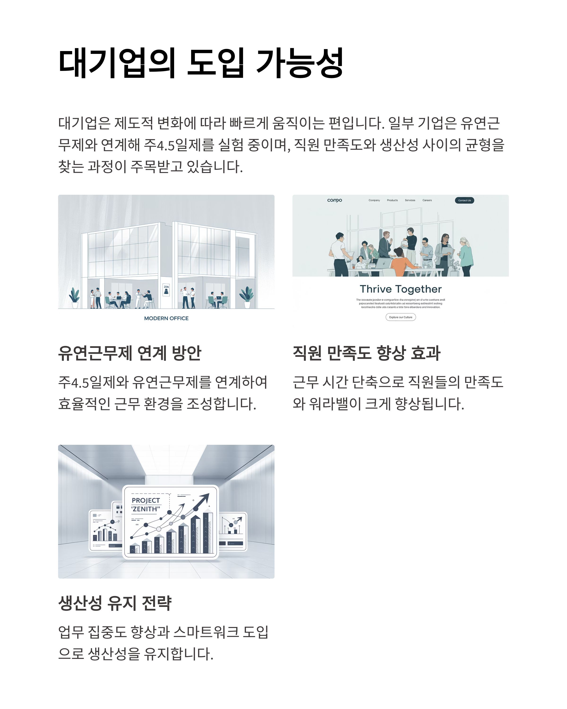 | 기업 | 생산성, 유연근무 | 직원 복지 강화 |