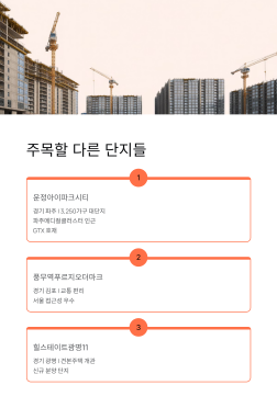 반포 래미안 트리니원 외에도 주목할 만한 단지들이 많아요. 경기 파주 '운정아이파크시티', 경기 김포 '풍무역푸르지오더마크', 충남 서산 '트리븐서산' 등이 대표적이죠.