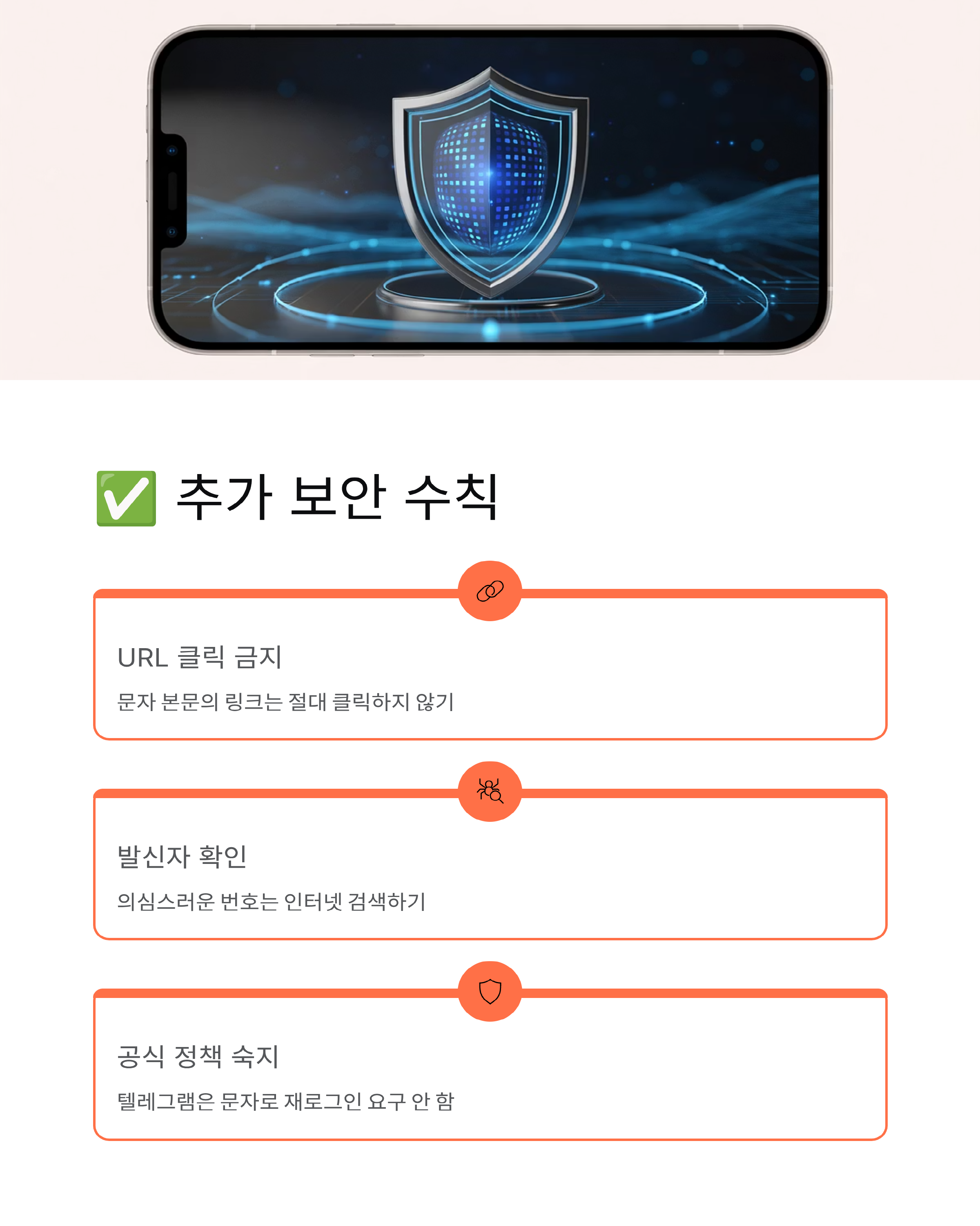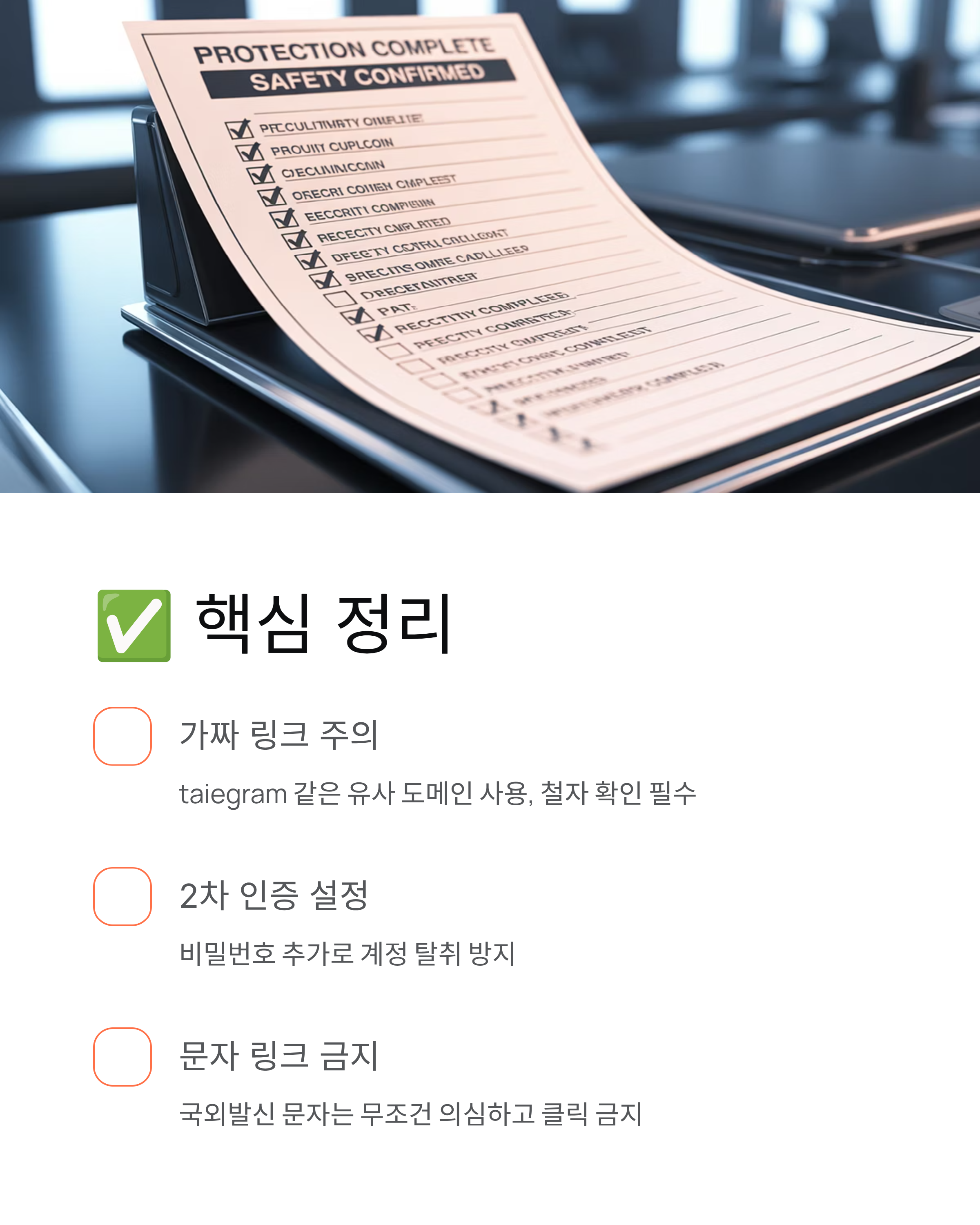 예방법은 간단해요. 문자 링크는 절대 클릭하지 않고, 텔레그램 2차 인증을 반드시 설정하세요. [국외발신] 문자는 무조건 의심하고, 조금이라도 이상하면 클릭하지 마세요!