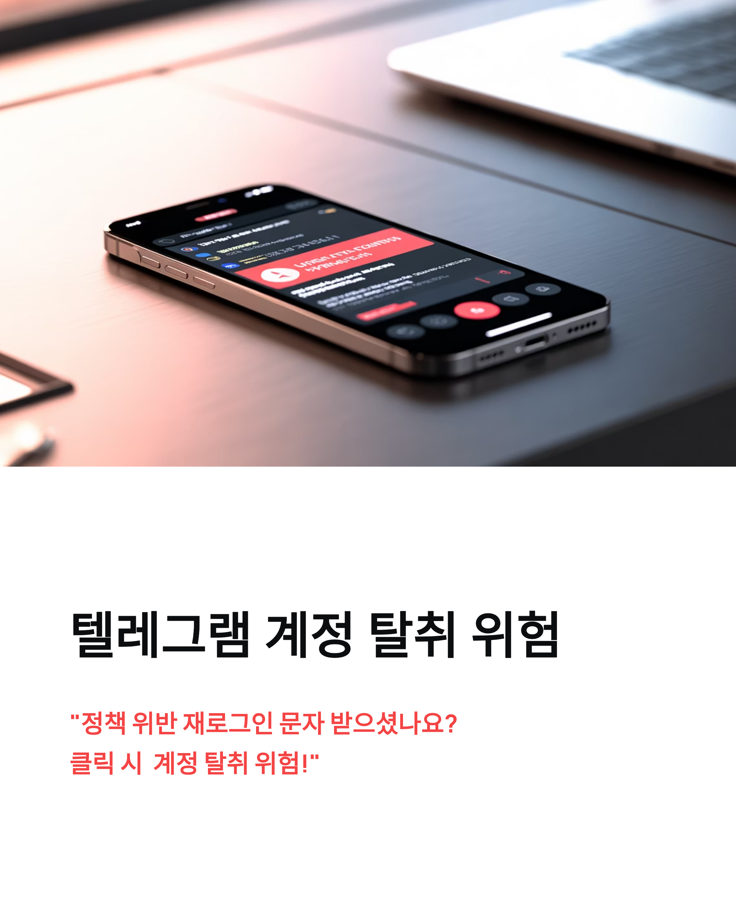 요즘 텔레그램 사용자들을 노린 정책위반 스미싱이 급증하고 있어요. "정책 위반으로 인해 재로그인하세요"라는 문자를 받고 링크를 클릭하면 계정이 순식간에 탈취될 수 있다는 사실, 알고 계셨나요?