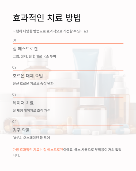 가장 효과적인 치료는 질 에스트로겐이에요. 국소적으로 사용하기 때문에 전신 부작용이 거의 없고 안전하답니다. 산부인과 상담을 통해 자신에게 맞는 방법을 찾으세요!