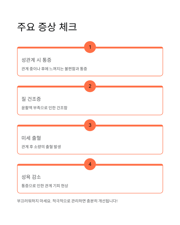 심한 통증이나 출혈이 있다면 산부인과 진료가 필요하며, 파트너와의 소통과 이해도 중요합니다. 부끄러워하지 말고 적극적으로 관리하면 충분히 개선할 수 있답니다!