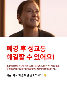폐경 후 성교통은 질 위축증으로 인해 성관계 시 통증이나 불편함을 느끼는 증상이에요. 폐경 여성의 약 50% 이상이 경험하는 매우 흔한 현상이랍니다.