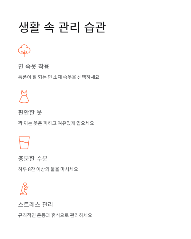 생활습관으로는 면 소재 속옷 착용, 꽉 끼는 옷 피하기, 스트레스 관리와 충분한 수분 섭취도 중요합니다.