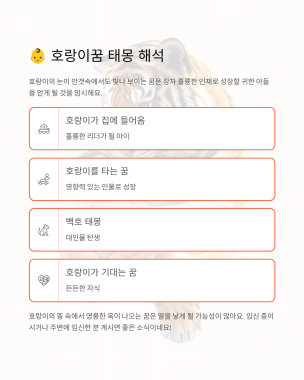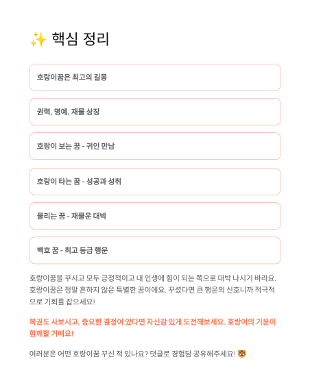 여러분은 어떤 호랑이꿈 꾸신 적 있나요? 그 후에 좋은 일 있었나요? 댓글로 경험담 공유해주세요! 다음 시간에는 '용꿈 해몽 완벽 가이드'로 찾아올게요. 기대해주세요! 🐉