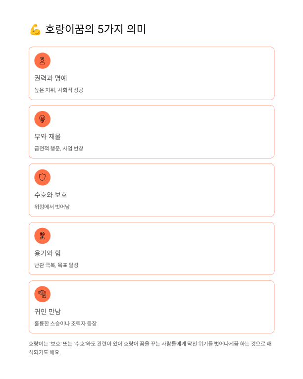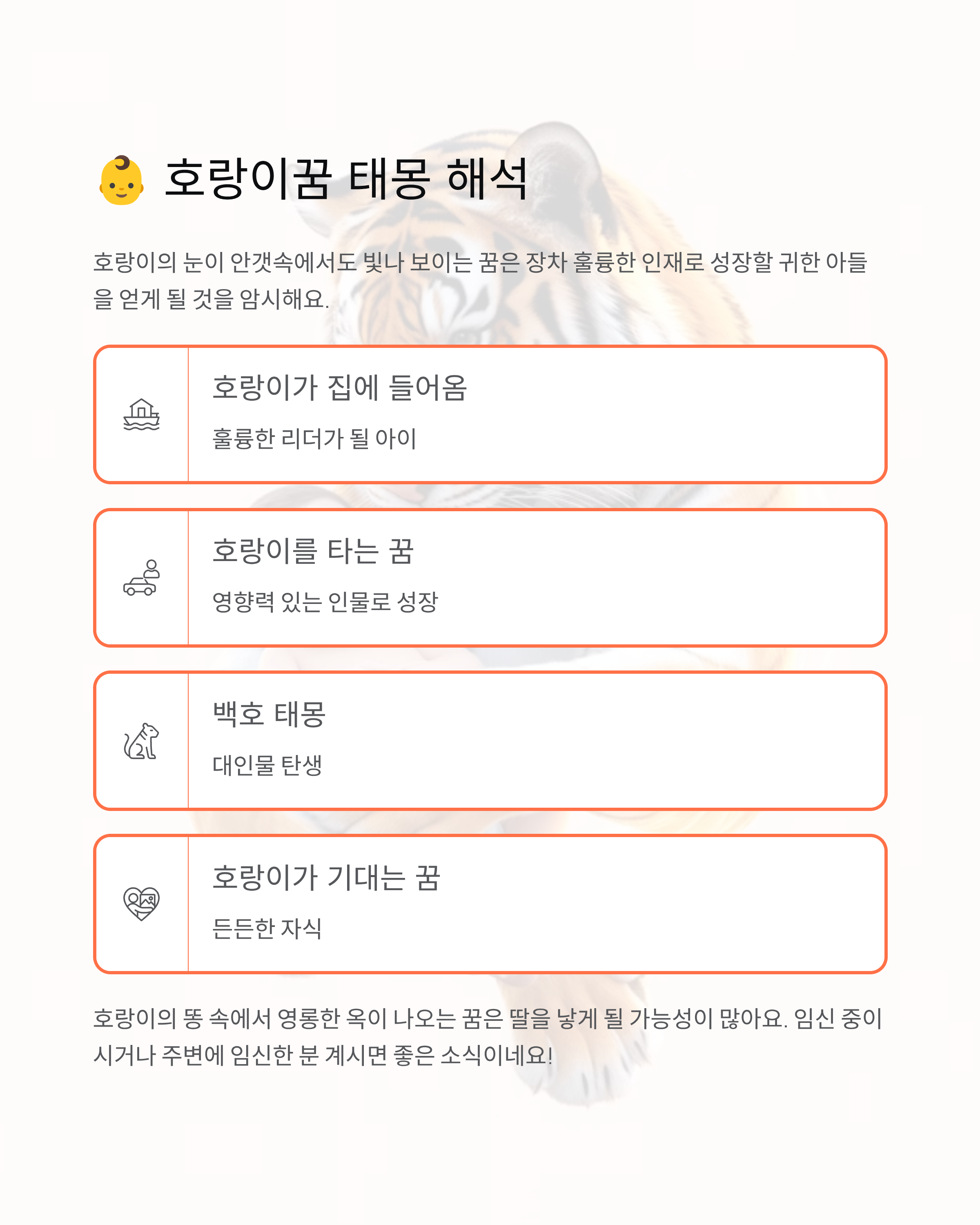 ✅ 호랑이꿈은 최고의 길몽 ✅ 권력, 명예, 재물 상징 ✅ 호랑이 보는 꿈 - 귀인 만남 ✅ 호랑이 타는 꿈 - 성공과 성취 ✅ 물리는 꿈 - 재물운 대박 ✅ 백호 꿈 - 최고 등급 행운 ✅ 태몽으로도 최상의 꿈
