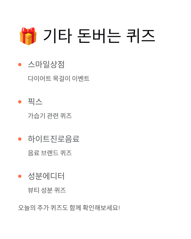 스마일상점 다이어트 목걸이, 픽스 가습기, 하이트진로음료, 성분에디터 등 오늘의 기타 퀴즈도 함께 확인해보세요!