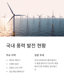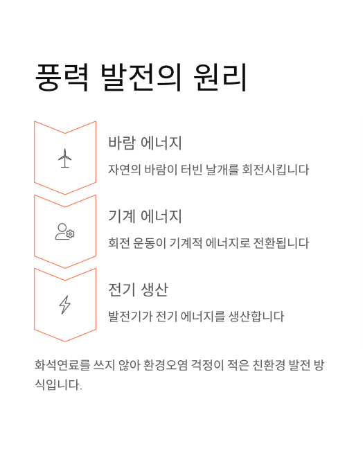 바람의 힘으로 터빈을 돌려 전기를 만드는 풍력 발전은 대표적인 재생에너지입니다. 화석연료를 쓰지 않아 환경오염 걱정도 적죠. 우리나라에서도 제주, 서해안 등에서 풍력 발전소가 점점 많아지고 있어요.