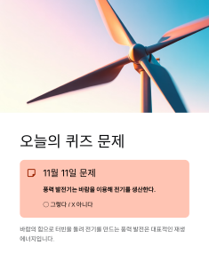 11월 11일 퀴즈 문제 “풍력 발전기는 바람을 이용해 전기를 생산한다”의 정답은 ‘그렇다’입니다. 경기도 기후행동 기회소득 앱에서 매일 퀴즈에 참여해 최대 6만원 리워드를 챙겨보세요! 만 7세 이상 경기도민 누구나 참여 가능하니, 오늘부터 함께 탄소중립 실천해요!