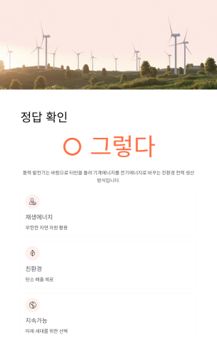 풍력 발전기는 바람으로 터빈을 돌려 기계에너지를 전기에너지로 바꾸는 친환경 전력 생산 방식입니다. 재생에너지 중 하나로 우리나라에서도 주목받고 있어요. 정답 입력 시 포인트 적립 잊지 마시고, 매일 꾸준한 참여로 작은 실천이 지구를 살리는 힘이 되길 바랍니다!