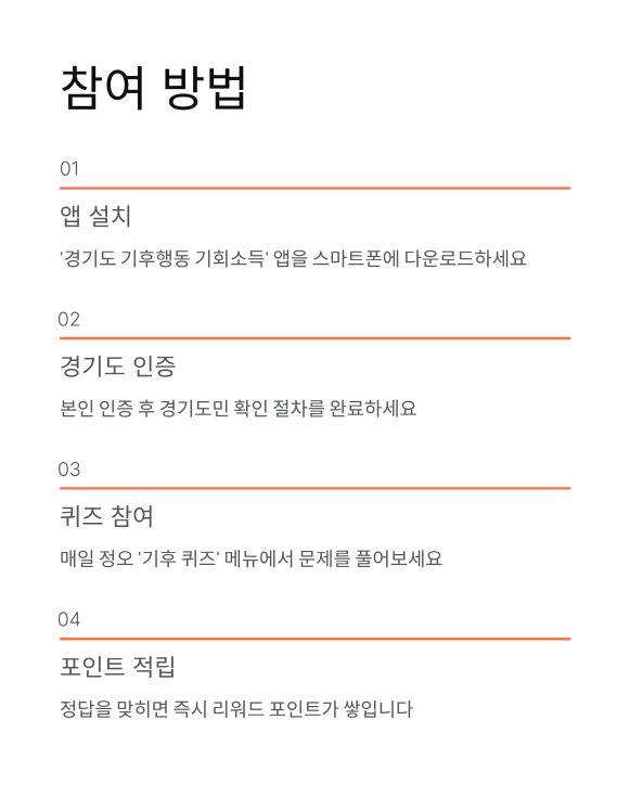 먼저 스마트폰에 ‘경기도 기후행동 기회소득’ 앱을 설치하세요. 경기도 인증 후 ‘기후 퀴즈’ 메뉴에서 매일 정오 출제되는 퀴즈에 참여하세요. 답을 맞히면 즉시 포인트가 쌓입니다.