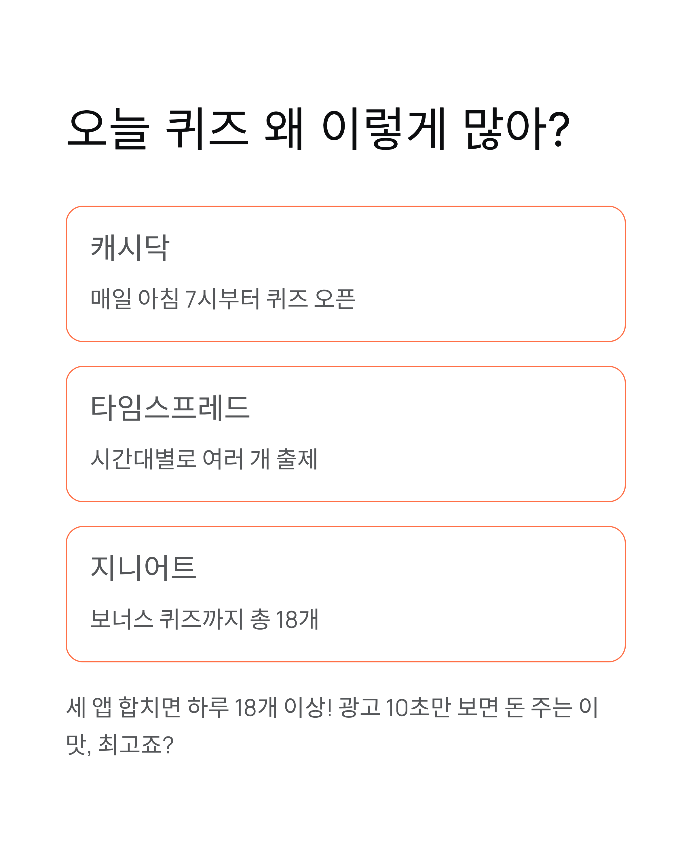 오늘 11월 21일도 캐시닥·타임스프레드·지니어트에서 퀴즈가 쏟아졌길래 새벽부터 다 풀고 정리해뒀습니다!