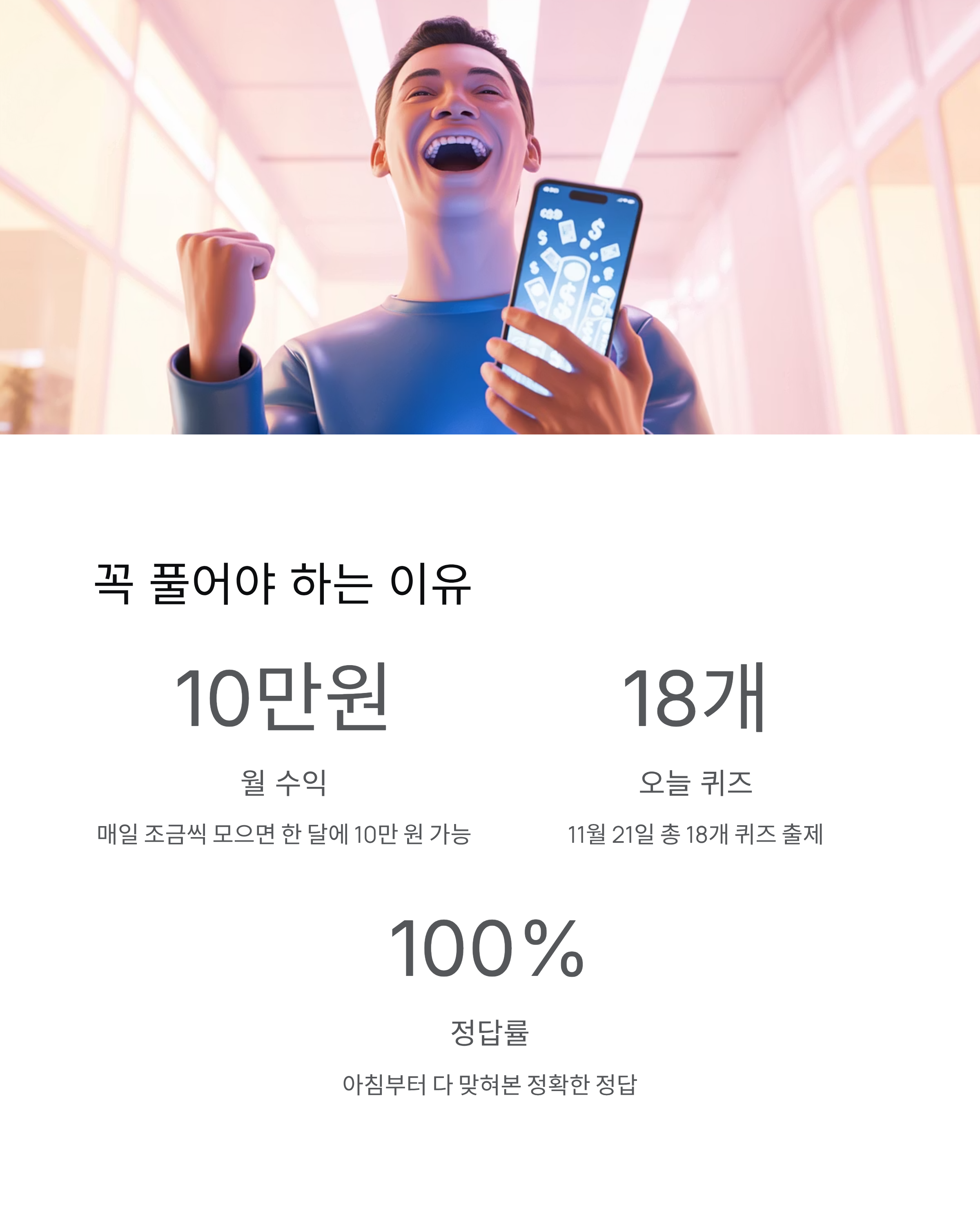 안녕하세요! 매일 아침 용돈퀴즈로 커피값 버는 앱테크 중독자예요 ㅋㅋ