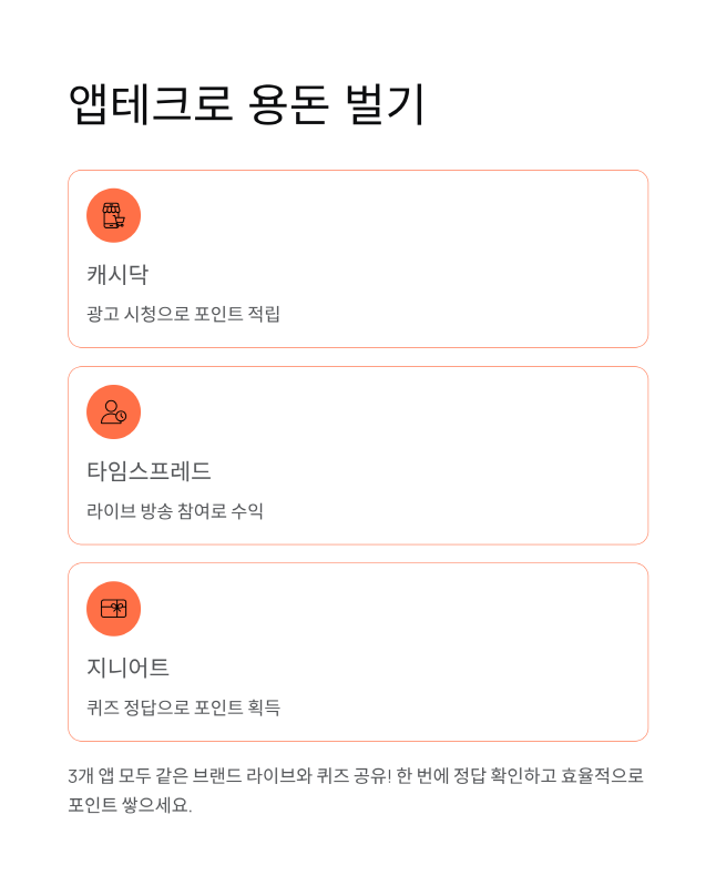 특히 이 3개 앱은 같은 브랜드 라이브를 공유하고, 용돈퀴즈 문제와 정답도 완전히 동일해요! 그래서 하나만 알면 세 곳에서 모두 사용할 수 있어서 효율이 엄청 좋죠. 매일 꾸준히 참여하면 한 달에 수만 원씩 쏠쏠하게 모을 수 있어요!