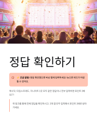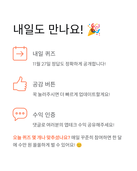 매일 꾸준히 참여하면 한 달에 수만 원 쏠쏠하게 벌 수 있어요. 내일도 새로운 퀴즈로 빠르게 찾아올게요!