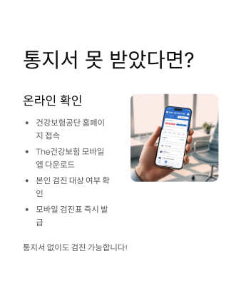 만약 통지서를 못 받았거나 잃어버렸다면 걱정하지 마세요. 건강보험공단 홈페이지나 The건강보험 모바일앱에서 본인의 검진 대상 여부를 확인할 수 있어요. 앱에서 바로 모바일 검진표도 발급받을 수 있고요.